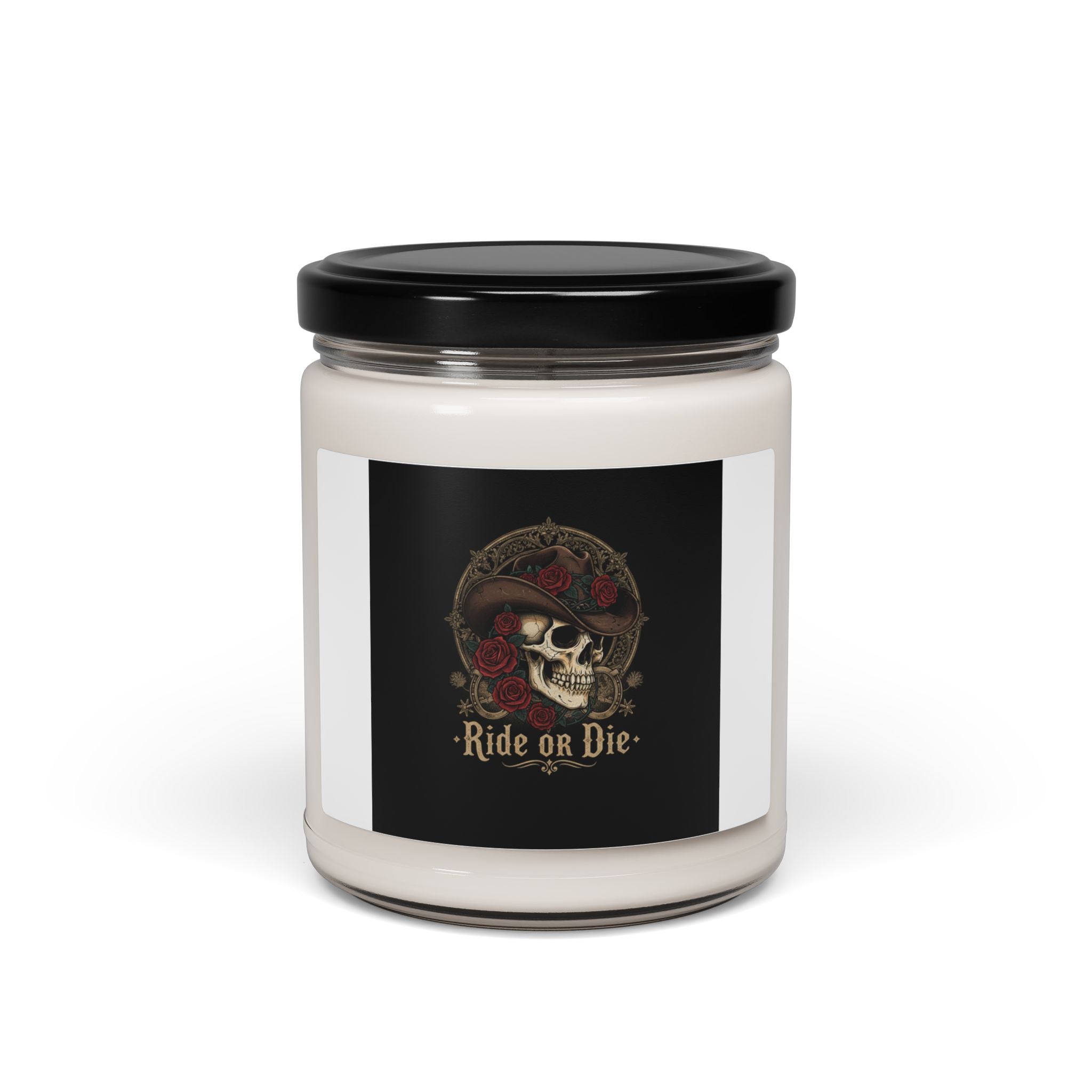 Dusty desert grit meets moonlit outlaw romance — a western-gothic scented soy candle wrapped in tattoo-style skull art. The label shows a sepia-toned skull wearing a weathered cowboy hat, framed by roses and barbed motifs that read as brooding, frontier noir. Choose a spice-forward or coastal scent to place this piece in a dim reading nook, biker loft, or moody mantel where dark Americana and alternative fashion aesthetics gather.