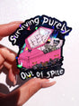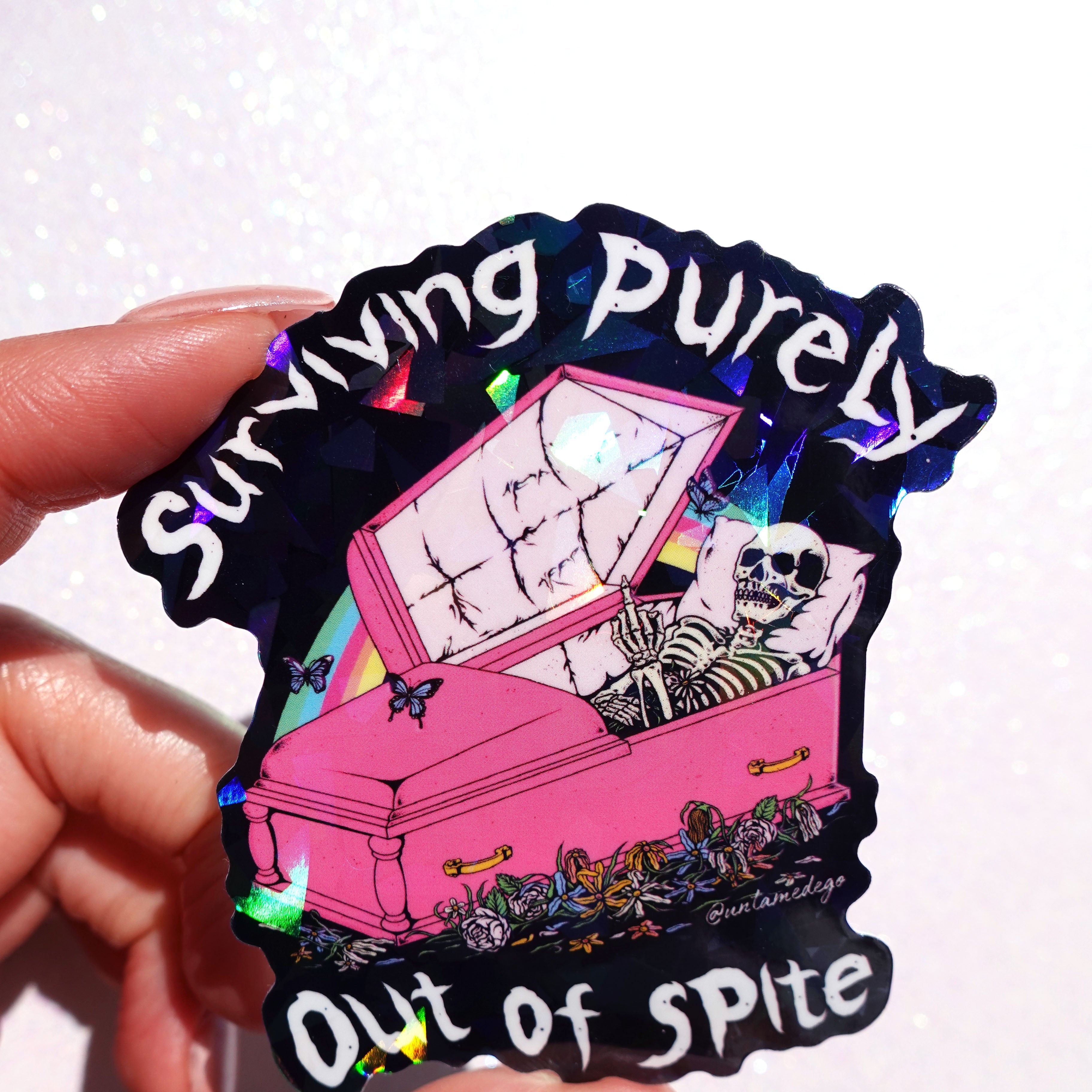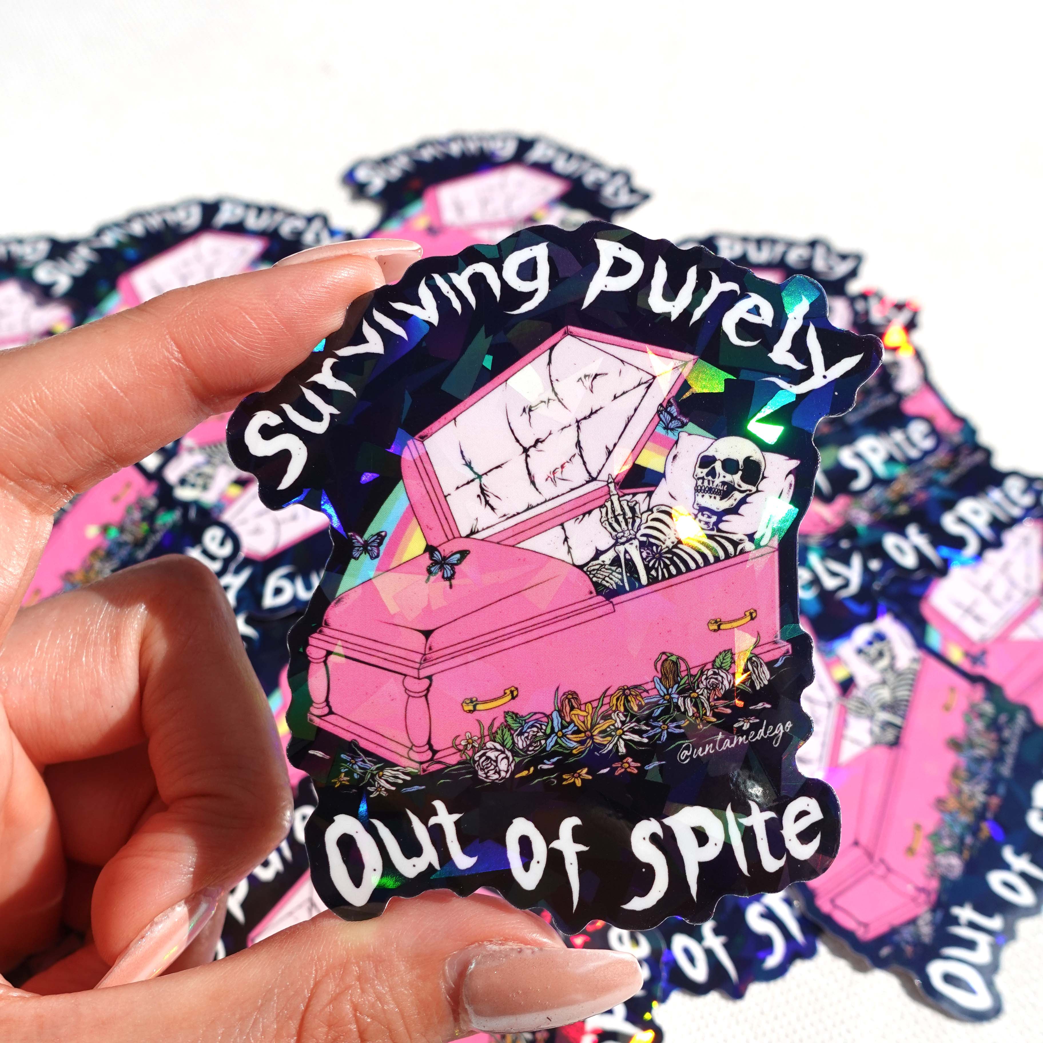 Bold, sarcastic, and sparkly. This glitter vinyl sticker features a skeleton lounging in a pink coffin with the phrase “Surviving Purely Out of Spite.” Dark humor meets sparkly sass, making this the perfect collectible for laptops, journals, and water bottles.